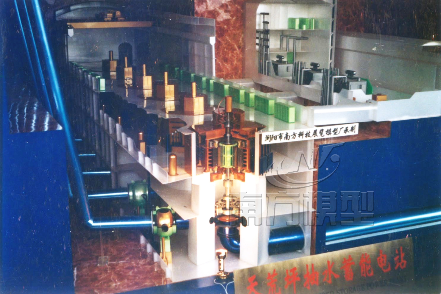 模型要將整個(gè)山形、山體、上庫(kù)區(qū)、下庫(kù)區(qū)、地面開關(guān)站、氣象雷達(dá)站、招待所、辦公大樓、中控室,地形按實(shí)際布局做出。地下廠房將山體局部剖開,能看到地下廠房?jī)?nèi)聲光流動(dòng)演示狀態(tài)。正面向?qū)⑸襟w做成全剖面形式。這樣可清楚看到,上水庫(kù)、下水庫(kù)、輸水系統(tǒng)、地下廠房。山體采用進(jìn)口玻璃鋼膠,進(jìn)口油漆及進(jìn)口裝飾材料制作。電站主廠房剖開,可以看到六臺(tái)機(jī)組的布置情況;其中做出一臺(tái)機(jī)組的剖面,詳細(xì)做出發(fā)電機(jī)的定子繞組、轉(zhuǎn)子、主機(jī)架和水輪機(jī)的進(jìn)水閥、導(dǎo)葉、轉(zhuǎn)輪、蝸殼、尾水管供水管路等。