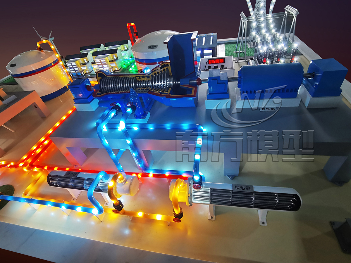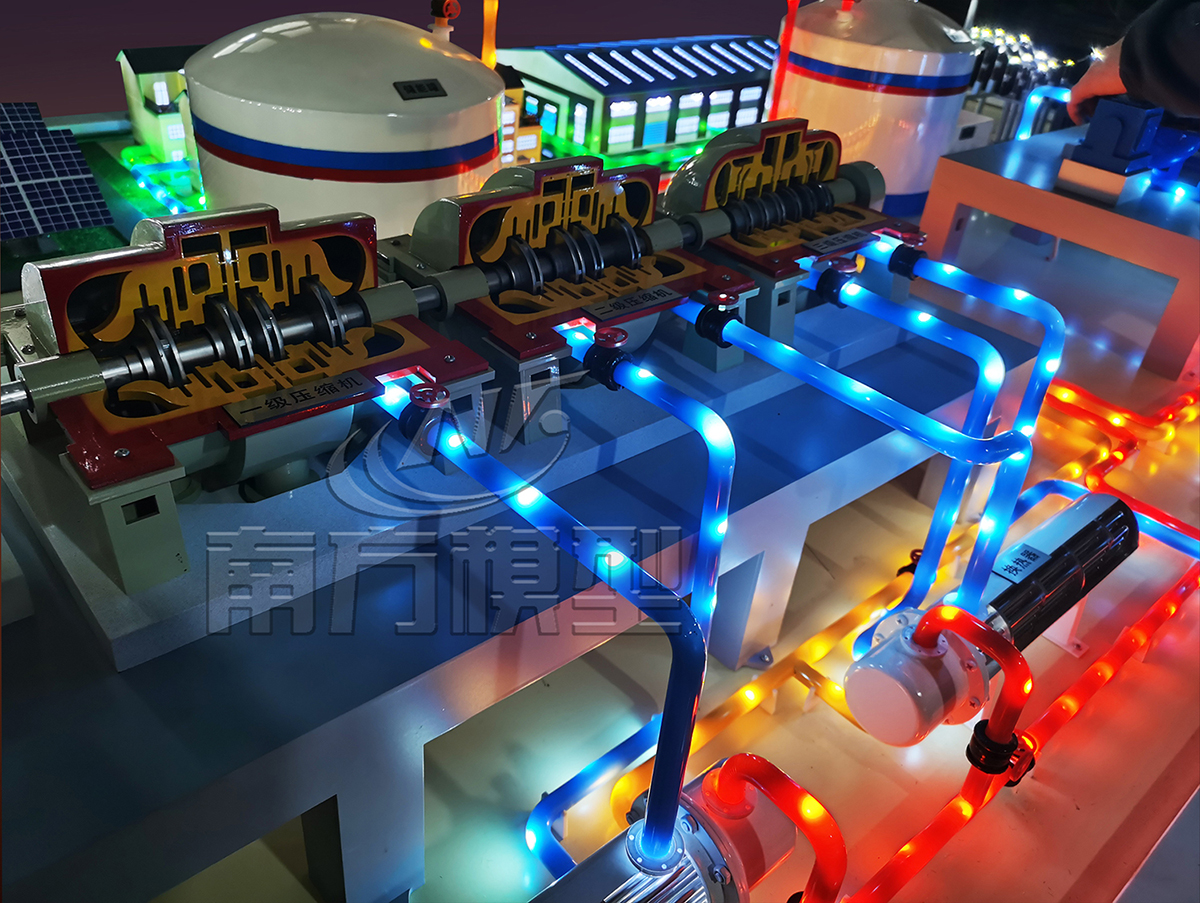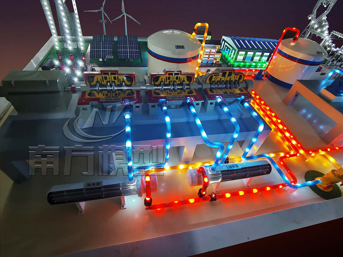 壓縮空氣儲(chǔ)能電站模型制作內(nèi)容: 儲(chǔ)能電站模型展示內(nèi)容按照儲(chǔ)能電站實(shí)際尺寸等比例微縮仿真制作,展示內(nèi)容包括壓縮空氣儲(chǔ)能車間、儲(chǔ)能容器、輸電線路、變電站、壓縮機(jī)、換熱器、透平系統(tǒng)等。該模型利用LED光電技術(shù)仿真模擬流質(zhì)與氣體運(yùn)行方向以及做功方式,其中透平系統(tǒng)、壓縮機(jī)、換熱器、儲(chǔ)熱容器等主要系統(tǒng)部件做¼剖視,詳細(xì)展示內(nèi)部結(jié)構(gòu)構(gòu)造與設(shè)備部件。透平系統(tǒng)與壓縮機(jī)仿真旋轉(zhuǎn)作模擬演示,設(shè)備主體噴涂汽車烤漆,色彩亮麗并具備工業(yè)質(zhì)感,適于長(zhǎng)期展示。