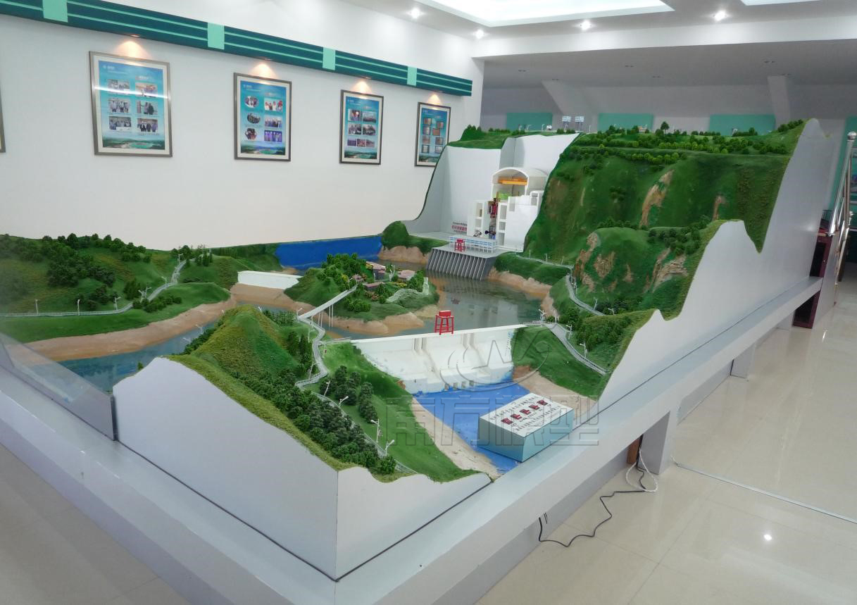 抽水蓄能電站整體布局仿真模擬實訓(xùn)設(shè)備按比例反映出庫區(qū)的地形地貌和各種建筑物以及各類設(shè)備實物,抽水蓄能電站機組模型采用一臺1/4剖面、機組蝸殼使用透明有機玻璃,進(jìn)行立體全包圍,能看到內(nèi)部的水輪機的形狀;模型清楚地表達(dá)了廠房的總體結(jié)構(gòu)和水電廠的各部分組成。